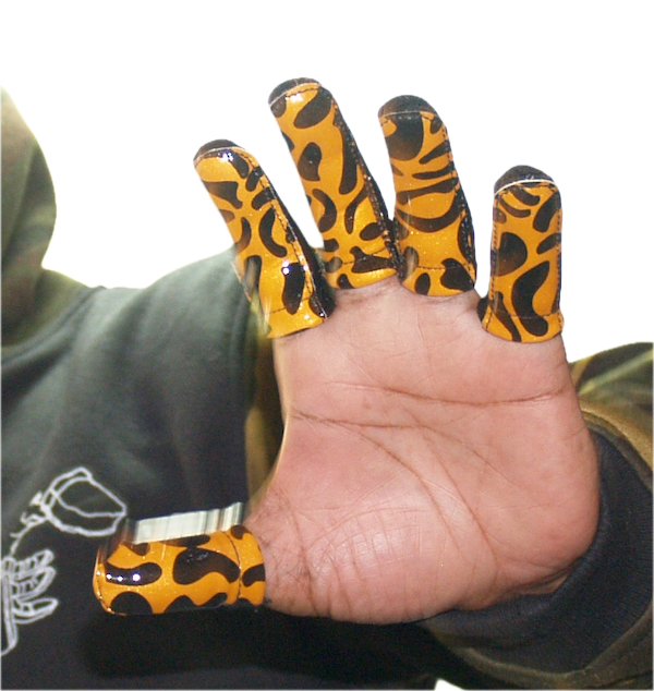 Hand made from stretchable breathable material on the back portion and synthetic leather, on the palmar side of each Finger Jacket®. FJ's are designed to enhance user grip in the fingers, and touch in the palm of the hand, simultaneously. Giving the user a better sense of touch, and a deeper/more secure grip on objects in the palm of the hand.